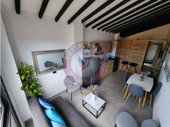Cuenta con un espacio pensado para el disfrute y la comodidad, una cama doble moderna, baño con agua caliente, cocina integral dotada con cafetera, platos, sartenes y mas para disfrutar de la cocina, una mesa comedor, y sala.